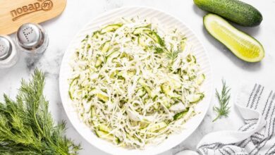 Легкий салат с фасолью из банки (белой или красной), свежим огурцом, маринованными огурцами, луком, петрушкой, заправкой из оливкового масла, лимонного сока, соли и перца.