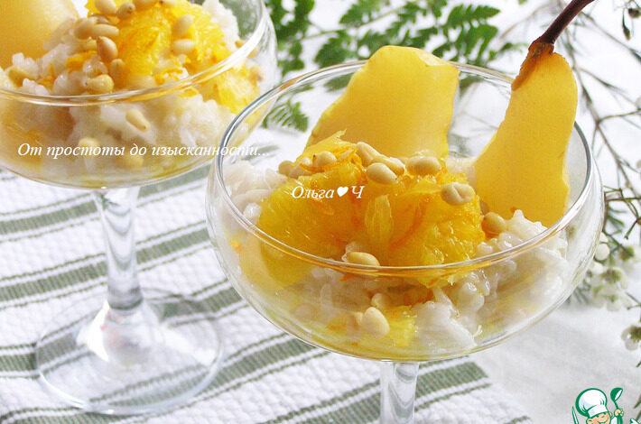 Рисовый пудинг в кокосовых сливках с грушей и апельсиновым соусом, дополненный кедровыми орешками — шикарный десерт для поста и не…