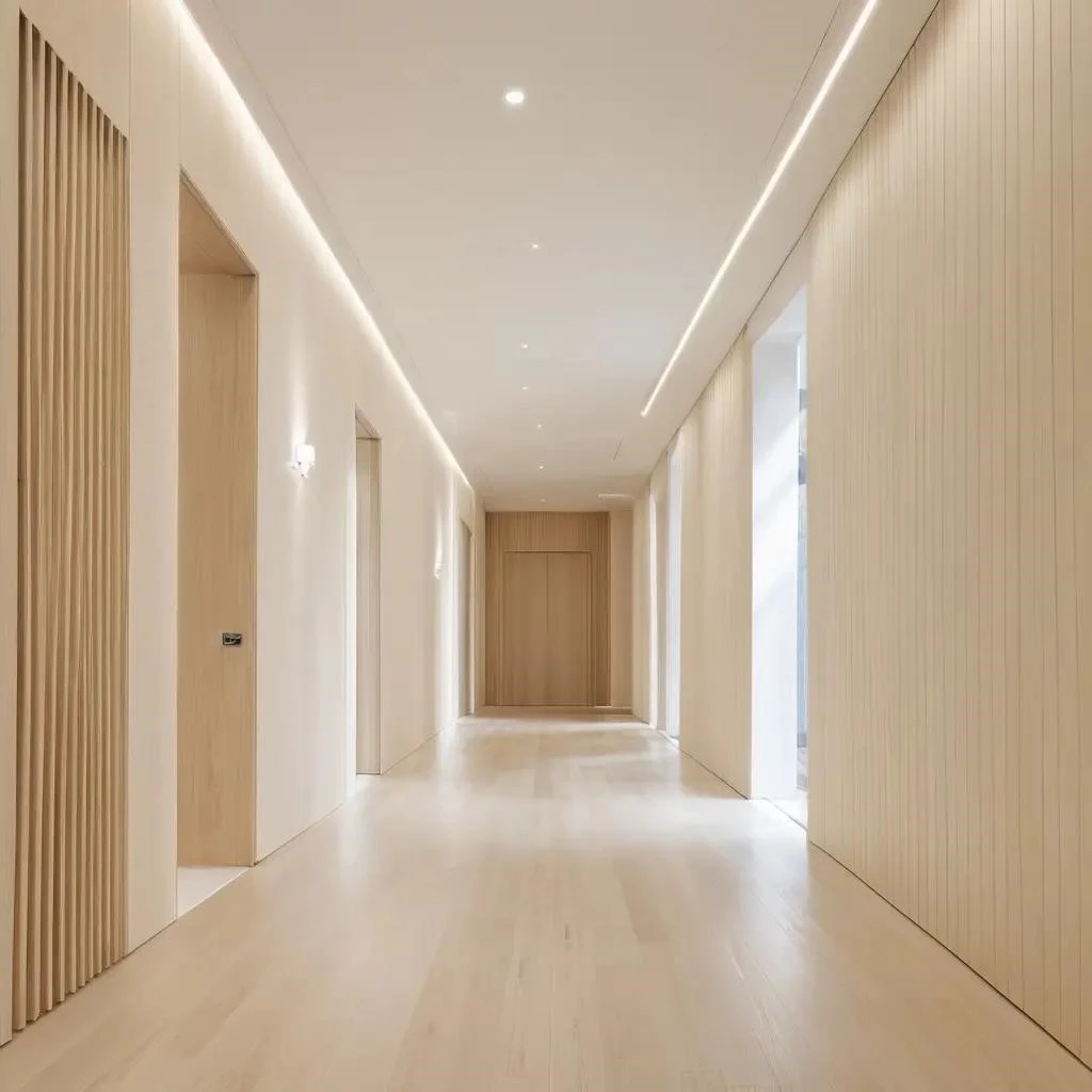 Светодизайнеры рекомендуют освещение для визуального поднятия низкого потолка в прихожей. Откажитесь от центральных люстр. Точечные светильники равномерно распределяют рассеянный свет. LED-лента за карнизом или в натяжном потолке формирует «парящий» эффект. Это увеличивает высоту, создавая иллюзию простора. Глянцевый потолок отражает свет. Подсветка светлых стен помогает расширить пространство в узком коридоре.