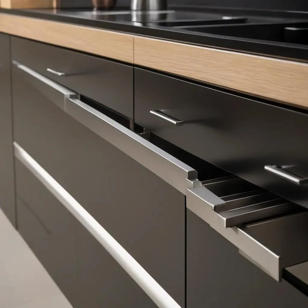 • Минимализм: Матовые черные профильные ручки или небольшие ручки-кнопки.