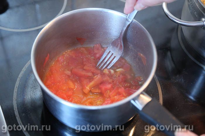 В отдельной посуде разогреть 1 ст.л. растительного масла, добавить помидоры и тушить на слабом огне, чтобы помидоры дали сок и хорошо прогрелись.