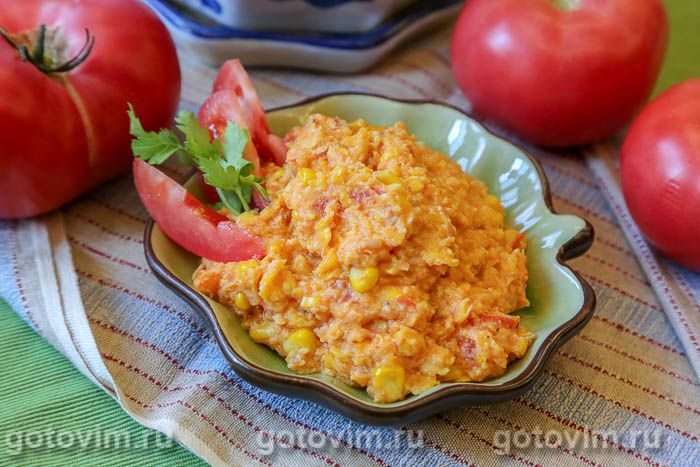 Переложить к томатам кукурузную кашу, размешать. Готовить 1-2 минуты под крышкой.