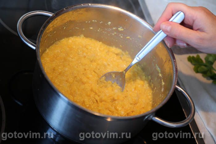 Влить примерно полстакана холодной воды, накрыть крышкой и продолжить готовить кукурузную кашу еще примерно 10 минут на слабом огне.