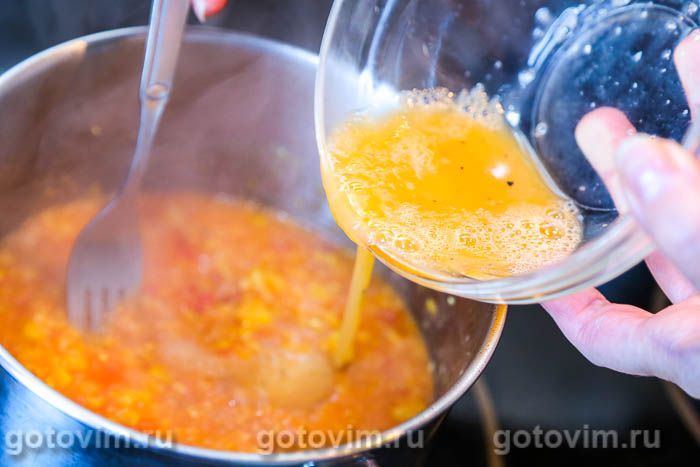 Влить в кастрюлю с кашей взбитое яйцо, быстро размешать, при необходимости еще посолить. Как только яйцо схватится, кастрюлю убрать с плиты. Всё, кукурузная каша с томатом готова. Остается разложить её по тарелкам, украсить свежей зеленью и тертым сыром. Подавать сразу, горячей. Приятного аппетита!