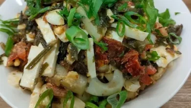 Смешайте всё в миске, добавив зелёный горошек.