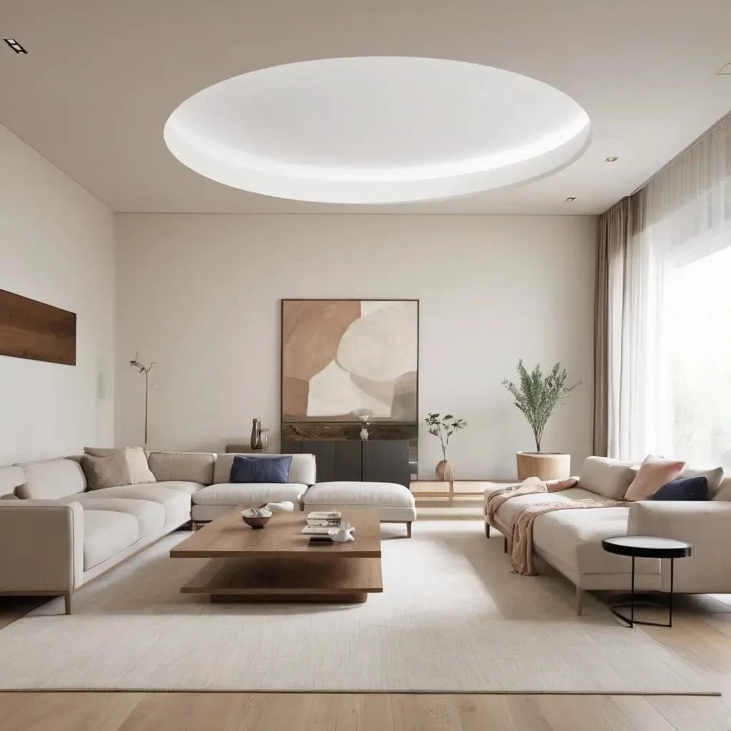 Матовый натяжной потолок предлагает сдержанную эстетику, имитируя идеально оштукатуренную поверхность. Его плюсы — отсутствие бликов, что создает спокойствие в гостиной. Он хорошо скрывает дефекты основного потолка. Такая фактура менее маркая, на ней незаметна пыль. Уход за потолком прост, что обеспечивает долговечность. Это практичный выбор для классического дизайна интерьера, ценящего комфорт и уют.