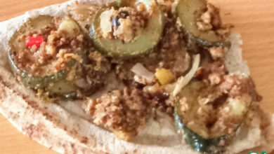 Сразу же, пока масса не стала плотной, выложите маринованный или свежий нарезанный лук. Можно просто присыпать измельченным зеленым луком и т.д. На этом же этапе допустимо добавить и другие овощи: помидоры, болгарский перец и т.д., а также зелень.