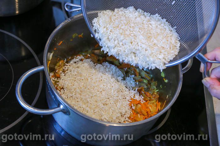 Рис для плова с грибами обязательно несколько раз промыть, пока вода после промывки риса не станет прозрачной, без белой взвеси. Хорошо промытый рис не превратится в кашу, и готовый плов будет рисинка к рисинке.