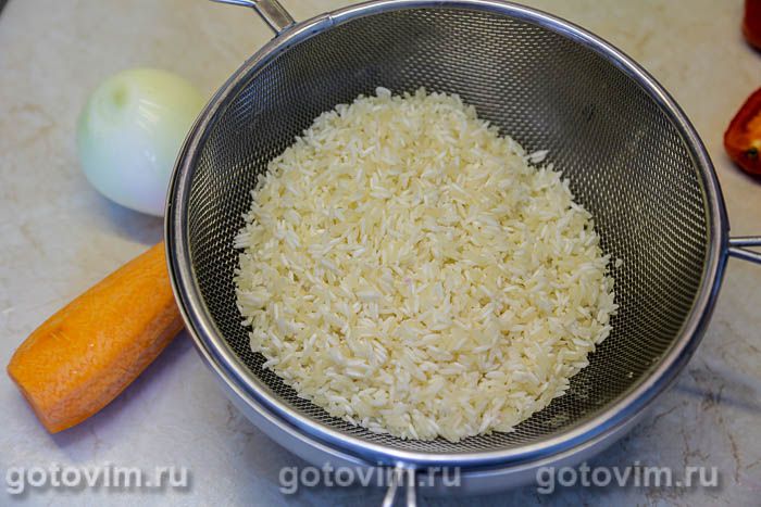 Промытый рис залить холодной, оставить на 40 минут. Затем откинуть рис на сито. Пусть вода стекает, пока вы будете заниматься овощами и грибами.