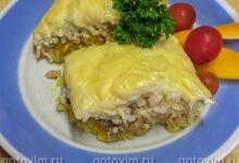 Засыпать рис, разровнять его поверх грибов с овощной поджаркой.