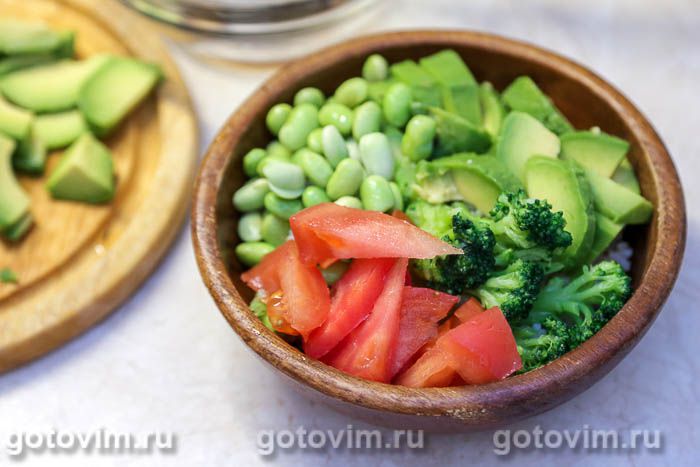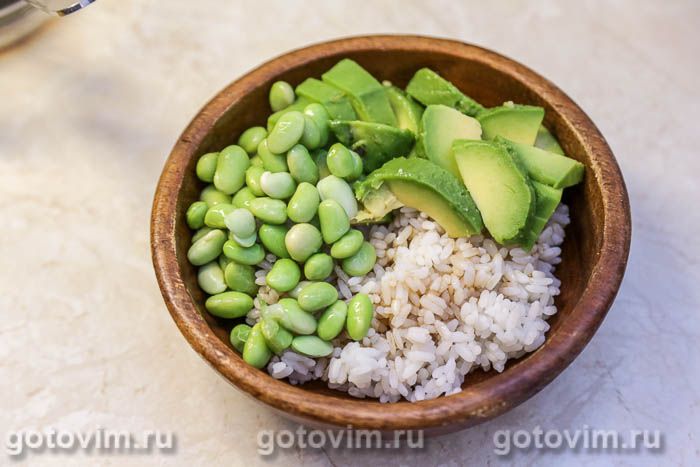 Поке-боул идеально подойдет и для завтрака, и для обеда, и для ужина. Этот вариант вегетарианский, здесь нет рыбы, мяса, сыра и яиц. Но вкусно! Если нет соевых бобов, то замените их, например, зеленым горошком или молодым горошком в стручках.