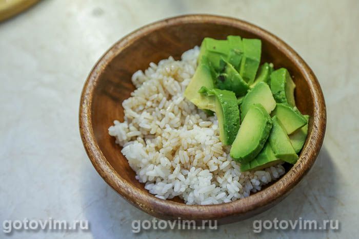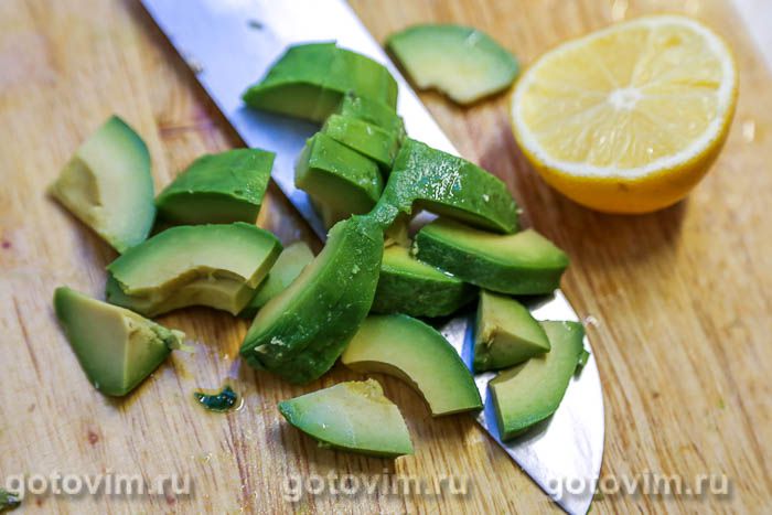 Авокадо разрезать пополам (надрезать кожицу и мякоть вдоль по окружности), удалить косточку и ложкой поддеть мякоть, отделяя её от кожицы. Нарезать мякоть авокадо дольками толщиной около 5 мм или кубиками. Чтобы авокадо не потеряло свой красивый зеленый цвет, полить его лимоном.
