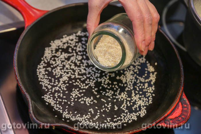 На сухой (без масла) сковороде поджарить кунжут. Пересыпать его на тарелку, дать остыть.