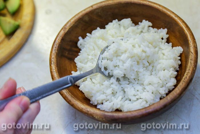 Все составляющие для поке готовы, можно собирать. В глубокую круглую миску (у меня для поке имеются деревянные) выложить примерно 3 вареного риса. Желательно, чтобы он оставался тёплым, а не холодным. Если остыл, то подогреть.