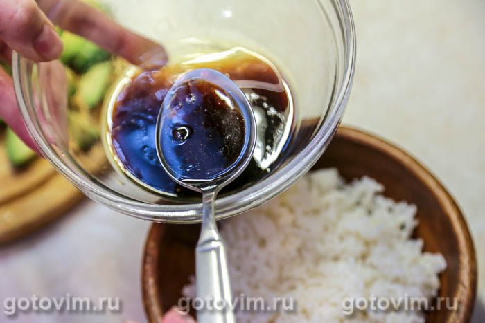 Полить рис соусом, посыпать нарезанными на полоски водорослями нори.