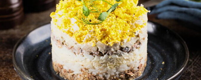 Классический салат Мимоза с сыром и рыбными консервами — прекрасная закуска для праздничного стола. Питательный салат традиционно готовят из рыбных…