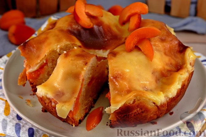 Мягкая воздушная основа из сладкого бездрожжевого теста на йогурте покрыта сочными половинками спелых абрикосов и шапочкой из густого заварного крема.…