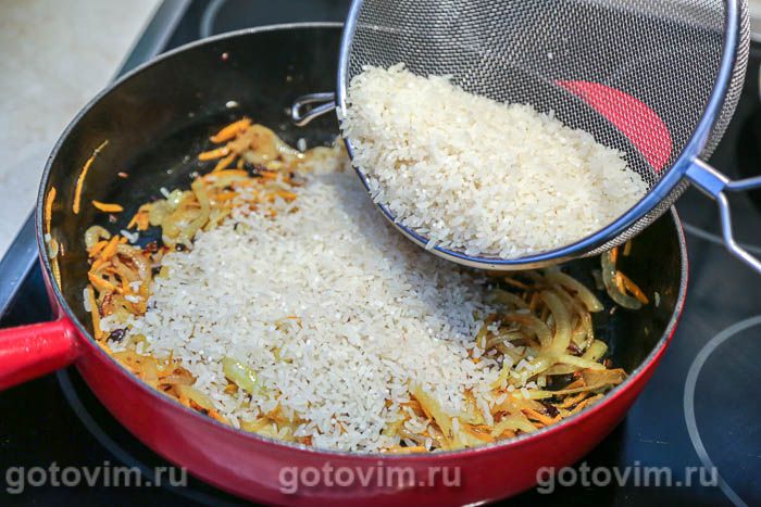 Теперь можно добавить рис. Пересыпать его в сковороду с овощной пассеровкой, перемешать и слегка обжарить, чтобы рис пропитался маслом и специями со сковороды. Посолить по вкусу.