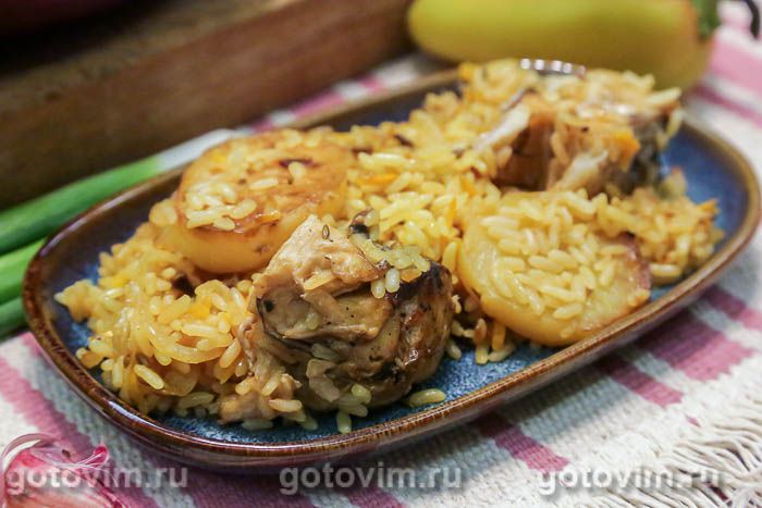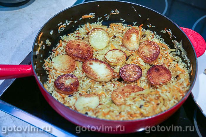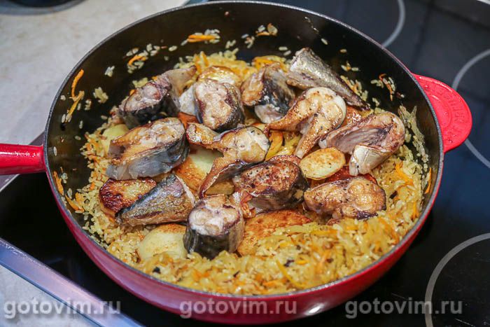 и кусочки обжаренной рыбы. Аккуратно переложить с края сковороды рис на картофель с рыбой, чтобы он был равномерно распределен поверх продуктов.