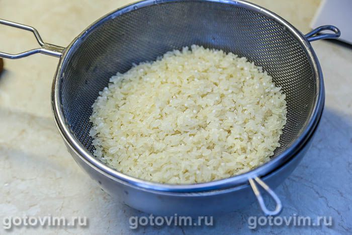Рис несколько раз промыть в холодной воде, оставить миске, залить холодной водой на 40 минут. Через 40 минут рис откинуть на сито и дать воде стечь.