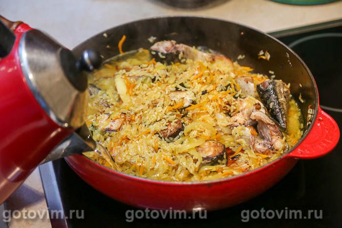 Залить рис с картошкой и рыбой питьевой водой, чтобы она полностью покрывала рис. Уровень воды должен на 1 см превышать уровень риса. Прикрыть сковороду крышкой, дать воде закипеть и уменьшить нагрев до минимального. Готовить плов с картофелем и рыбой примерно 15 минут, пока вода полностью не впитается в рис, и он не пропарится до готовности. Снять со сковороды крышку, аккуратно перемешать рис, чтобы рыба и картофель равномерно распределились в плове.