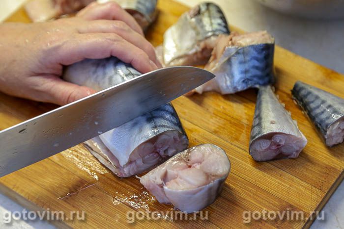 Скумбрию промыть, выпотрошить, обтереть бумажными полотенцами снаружи и внутри брюшка. Срезать все плавники и отрубить голову. Нарезать тушку кусочками длиной по 4-5 см. Посыпать солью, молотым черным перцем и полить соком дольки лимона. Дать рыбе промариноваться примерно 30 минут.