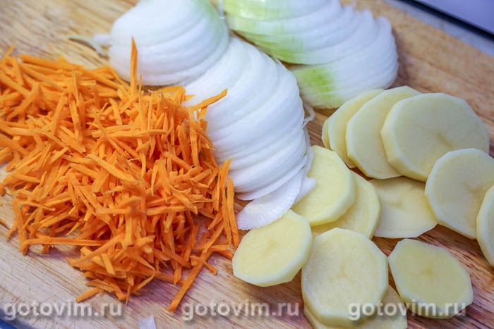Подготовить овощи для плова. Лук очистить и нарезать полукольцами. Очищенную морковь натереть на крупной терке или нарезать соломкой. Можно использовать терку для корейской моркови. Очищенный картофель нарезать кружочками толщиной 5-7 мм. Толще не надо.
