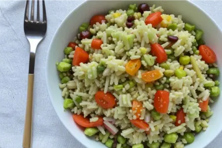Рецепт «Завтрак туриста»: с рисом, морковью, болгарским перцем, огурцом, кукурузой, ветчиной или куриной грудкой, оливыми маслями, лимонным соком и свежей…