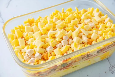 Слоёный салат из курицы с ананасами, отварной куриной грудкой, сыром, яйцами, орехами и майонезом по вкусу — вкусное и насыщенное…