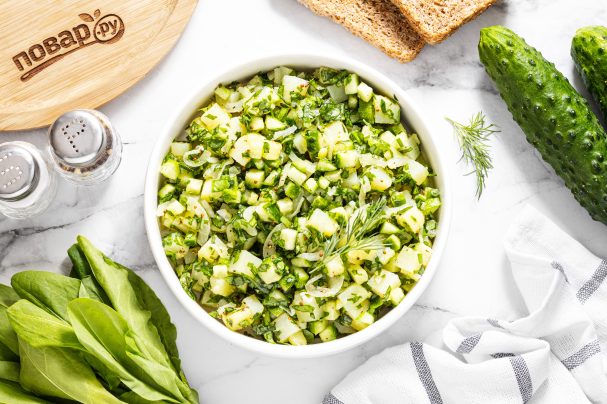 Описание приготовления: Ниже я расскажу подробнее, как приготовить салат с щавелем. Вместо свежих огурцов можно взять соленые, а оливковое масло…