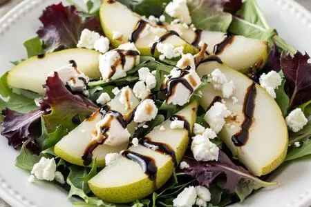 Свежий салат с грушей, спелой грушей, листьями рукколы, ромэна или латука, сыром фета или козьим сыром, орехами, оливковым маслом, лимонным…