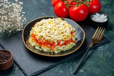 Рыбный салат мимоза из консервированной рыбы (сайра, горбуша или тунец), картофель, морковь, яйца, майонез, зелень, специи — вкусное и простое…