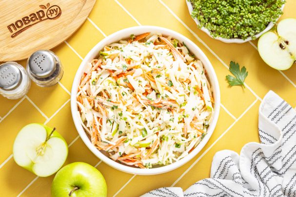 Описание приготовления: Ниже я расскажу подробнее, как приготовить салат из капусты с яблоком. Яблоко выбирайте зеленое, кислых сортов, например Гренни…