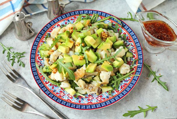 Описание приготовления: Салат понравится любителям рыбных и овощных салатов. Вместо рукколы можно взять смесь любой зелени, айсберг или кочанный салат.…