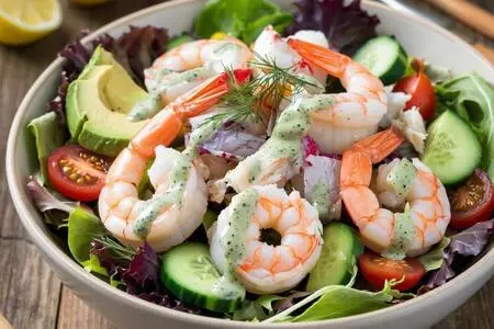Вкусный салат с креветками из свежих огурцов, помидоров, авокадо и зелени, заправленный лимонным соком, оливковым маслом, горчицей и специями для…