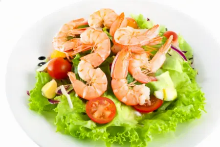 Свежий салат из креветок с отваренными очищенными креветками, огурцом, авокадо, листьями салата, лимонным соком, оливковым маслом, солью и перцем. Ингредиенты…
