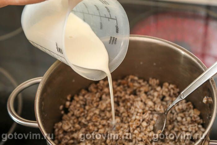 Влить в кастрюлю с перловкой на воде сливки или молоко.