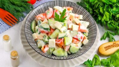 Добавляю в обширную копилочку крабовых салатов этот нежный и воздушный салатик. Как подавать к столу решать Вам, закуска хороша и в общем салатнике, и в порционных креманках, и в тарталетках/волованах и на кусочках хлеба. Угощайтесь!