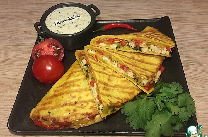 Кесадилья — блюдо мексиканской кухни, состоящее из лепешки, наполненной начинкой. Начинка может быть абсолютно разной, у меня — курица, овощи,…