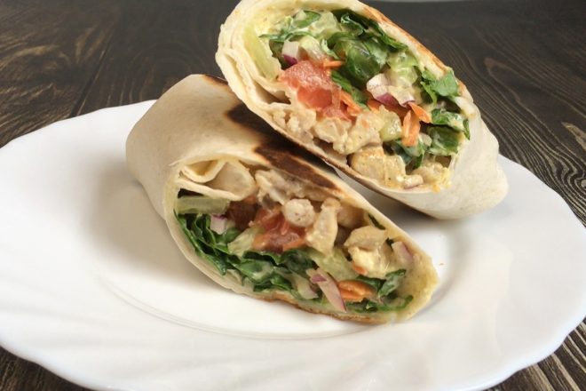 08.06.202596Шаурма в тортилье с курицей и белым соусом