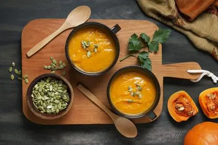 Осенний суп из тыквы с луком, чесноком, оливковым маслом и овощным бульоном, украшенный тыквенными семечками и свежей зеленью. Вкусно и…